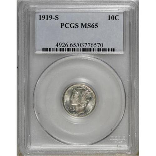 <B>1919-S 10C MS65 PCGS.</B></I> PCGS Population (27/18). NGC Census: (22/15). Mintage: 8,850,000. Numismedia Wsl. Price for NGC/PCGS coin in MS65: $760. (#4926)<BR><BR><B>Coin Engraver:</B> Adolph A. Weinman<BR><BR><b>Shipping:</b> Coins & Currency (<a target="_blank" href="http://www.heritageauctions.com/common/shipping.php">view shipping information</a>)