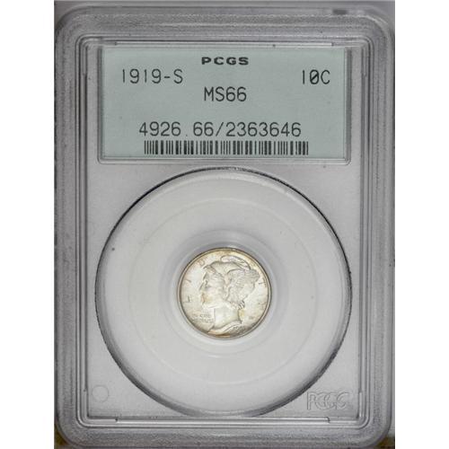 <B>1919-S<10C> MS66 PCGS.</B></I> The pretty surfaces intermingle russet with lemon-yellow and jade-green on the obverse, while the reverse offers a consistent light gold patina. Extremely eye-appealing, and certified in a first generation green label holder. Population: 15 in 66, 2 finer (4/06).