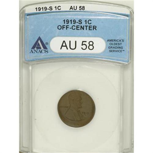 <B>1919-S 1C Lincoln Cent--Off Center--AU58 ANACS.</B></I><BR><BR><B>Coin Engraver:</B> Victor D. Brenner<BR><BR><b>Shipping:</b> Coins & Currency (<a target="_blank" href="http://www.heritageauctions.com/common/shipping.php">view shipping information</a>)