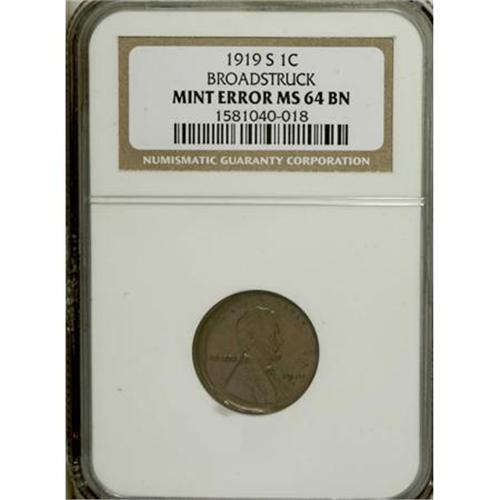 <B>1919-S 1C Lincoln Cent--Broadstruck--MS64 Brown NGC.</B></I> <BR><BR><B>Coin Engraver:</B> Victor D. Brenner<BR><BR><b>Shipping:</b> Coins & Currency (<a target="_blank" href="http://www.heritageauctions.com/common/shipping.php">view shipping information</a>)