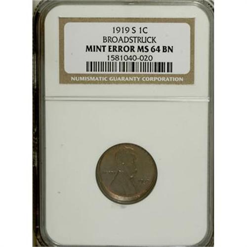 <B>1919-S 1C Lincoln Cent--Broadstruck--MS64 Brown NGC.</B></I> <BR><BR><B>Coin Engraver:</B> Victor D. Brenner<BR><BR><b>Shipping:</b> Coins & Currency (<a target="_blank" href="http://www.heritageauctions.com/common/shipping.php">view shipping information</a>)