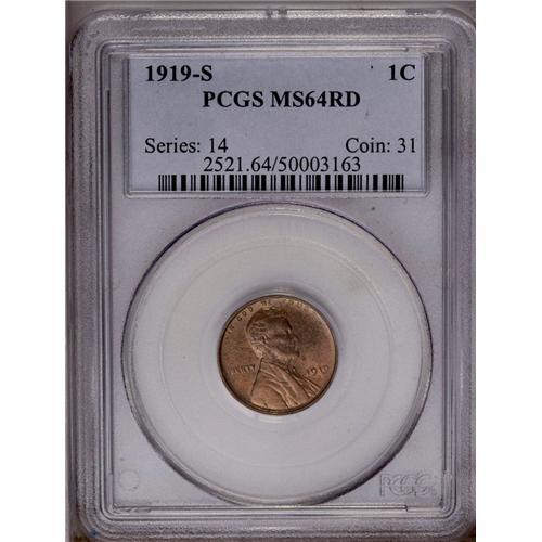 <B>1919-S<1C> MS64 Red PCGS.</B></I> A conditionally challenging date, the present survivor exhibits a pinkish-orange sheen that is free of all but a few wispy blemishes. Some minor muting of color is noted over the obverse. The otherwise bold strike wanes a little over the upper reverse.
