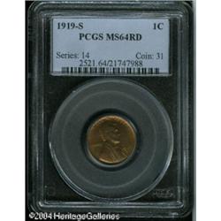 1919-S 1C MS64 Red PCGS. Satiny luster illuminates <B>1919-S 1C MS64 Red PCGS.</B></I> Satiny luster illuminates the honey and olive surfaces of this reasonably struck and unabraded Choice branch mint Cent. Glimpses of lilac color accompany the highpoints of the portrait. <BR><BR><B>Important notice:</B> Heritage usually auctions material at the rate of 200-250 lots per hour. On some occasions eBay Live bid software or the Internet may not be able to keep up with the pace of the auction. We recommend placing a realistic absentee bid now as insurance to avoid disappointment. Occasionally the auctioneer may eliminate or reject an eBay Live bid, and the auctioneer may also reopen a lot after the close of the eBay live bidding (usually because we missed an audience bid), and may reject your bid even if it shows you as the winning bidder. By bidding via eBay Live, you agree that Heritage may award the lot to another bidder at its sole discretion under the circumstances described above or any other reasonable circumstances. Since eBay bids are not shown to us until we open the lot on the floor, we treat those bids just like floor bids. In most cases the floor responds before the eBay bid is presented to us, due to Internet lag time, so for consistency we have made it a policy that floor bids are always considered first over tie eBay live bids. Also please note that all Heritage lots purchased through eBay Live carry a 20% Buyer's Premium. Please make sure you read the Terms and Conditions before you bid. This lot is being auctioned in conjunction with a live floor auction by Heritage Galleries & Auctioneers. All final auction and invoice information will be supplied by Heritage Galleries & Auctioneers, and all other information should be considered preliminary. Lot:5280
