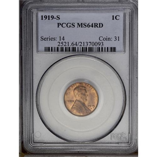 <B>1919-S<1C> MS64 Red PCGS.</B></I> Subdued, almost mellow red-copper color emblazoned evenly over all surfaces. Almost blemish-free and quite attractive. A better example of this date.<BR><I>From The Kendall Marie #4 All-Time Finest PCGS Registry of Lincoln Cents with Varieties, Circulation Strikes, 1909-1958.</B></I> <BR><BR><B>Important notice:</B> Heritage usually auctions material at the rate of 200-250 lots per hour. On some occasions eBay Live bid software or the Internet may not be able to keep up with the pace of the auction. We recommend placing a realistic absentee bid now as insurance to avoid disappointment. Occasionally the auctioneer may eliminate or reject an eBay Live bid, and the auctioneer may also reopen a lot after the close of the eBay live bidding (usually because we missed an audience bid), and may reject your bid even if it shows you as the winning bidder. By bidding via eBay Live, you agree that Heritage may award the lot to another bidder at its sole discretion under the circumstances described above or any other reasonable circumstances. Since eBay bids are not shown to us until we open the lot on the floor, we treat those bids just like floor bids. In most cases the floor responds before the eBay bid is presented to us, due to Internet lag time, so for consistency we have made it a policy that floor bids are always considered first over tie eBay live bids. Also please note that all Heritage lots purchased through eBay Live carry a 20% Buyer's Premium. Please make sure you read the Terms and Conditions before you bid. This lot is being auctioned in conjunction with a live floor auction by Heritage Galleries & Auctioneers. All final auction and invoice information will be supplied by Heritage Galleries & Auctioneers, and all other information should be considered preliminary. Lot:499 <BR><BR><B>Winning Notification and Billing:</B> After the FINAL session in this auction is complete, Heritage will send e-mail and snail mail invoices. This process normally takes several days. All final auction and invoice information will be supplied by Heritage Galleries & Auctioneers, and all other information should be considered preliminary. <BR><BR>This auction will be conducted on a live auction floor and over the Internet through eBay Live. If you choose to place an absentee bid, please take a moment to <font color='#0000ff'><u><a href='http://pages.ebay.com/liveauctions/help/before/laabsentee.html'>learn how eBay Live absentee bidding works</a></u></font><font color='#000000'>