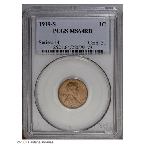 <B>1919-S<1C> MS64 Red PCGS.</B></I> This pleasing near Gem displays a nice strike and no significant contact marks. A couple of tiny flecks are noted in the lower right (facing) obverse field. Population: 106 in 64, 20 finer (9/05).
