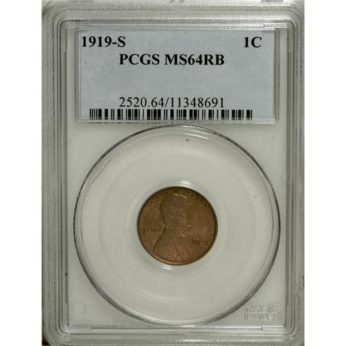 <B>1919-S 1C MS64 Red and Brown PCGS.</B></I> PCGS Population (129/22). NGC Census: (75/21). Mintage: 139,760,000. Numismedia Wsl. Price: $280. (#2520)<BR><BR><b>Shipping:</b> Coins & Currency (<a target="_blank" href="http://www.heritageauctions.com/common/shipping.php">view shipping information</a>)
