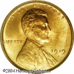 1919-S 1C MS65 Red NGC. A well struck pale pumpkin <B>1919-S 1C MS65 Red NGC.</B></I> A well struck pale pumpkin-orange Gem with pleasing pervasive luster and a glimpse of iridescent lemon, rose, and lime hues on the lower reverse margin. Surprisingly devoid of carbon or contact, the present piece is a prize for the connoisseur of early Lincoln Cents. Population: 6 in 65, none finer (11/04). <BR><BR><B>Important notice:</B> Heritage usually auctions material at the rate of 200-250 lots per hour. On some occasions eBay Live bid software or the Internet may not be able to keep up with the pace of the auction. We recommend placing a realistic absentee bid now as insurance to avoid disappointment. Occasionally the auctioneer may eliminate or reject an eBay Live bid, and the auctioneer may also reopen a lot after the close of the eBay live bidding (usually because we missed an audience bid), and may reject your bid even if it shows you as the winning bidder. By bidding via eBay Live, you agree that Heritage may award the lot to another bidder at its sole discretion under the circumstances described above or any other reasonable circumstances. Since eBay bids are not shown to us until we open the lot on the floor, we treat those bids just like floor bids. In most cases the floor responds before the eBay bid is presented to us, due to Internet lag time, so for consistency we have made it a policy that floor bids are always considered first over tie eBay live bids. Also please note that all Heritage lots purchased through eBay Live carry a 20% Buyer's Premium. Please make sure you read the Terms and Conditions before you bid. This lot is being auctioned in conjunction with a live floor auction by Heritage Galleries & Auctioneers. All final auction and invoice information will be supplied by Heritage Galleries & Auctioneers, and all other information should be considered preliminary. Lot:5281