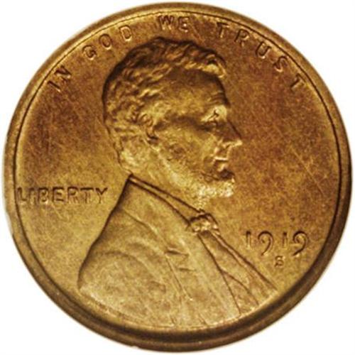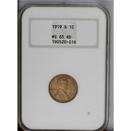 <B>1919-S<1C> MS65 Red NGC.</B></I> Full Red Gems of this issue are extremely elusive, since so many pieces have been dipped, cleaned, recolored, or otherwise abused in some way. This charming piece shows a bold strike on the obverse, with a bit of peripheral weakness noted in PL of the motto. The obverse is somewhat mellowed to tan-gold, with a woodgrain effect, while the reverse is a lighter orange-gold. The surfaces are cumulatively well within the interpretation of the Red designation. Careful scrutiny with a loupe reveals no mentionable surface abrasions or carbon. Lincoln cent aficionados will recognize this coin for the rare opportunity it presents. Census: 6 in 65 Red, 0 finer (8/06).