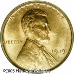 <B>1919-S 1C MS65 Red NGC.</B></I> The 1919-S is not in the same strike rarity class as the 1918-S, but, as a rule, it is still a poorly defined issue with many of the 139.7 million coins produced having been struck from worn dies. As one might surmise from the condition under which this date was produced, the '19-S is not at all common in the finer Mint State grades, particularly with luster that is full and undiminished. Lovely golden-red luster ripples over both sides of this Gem quality survivor with a bright, attractive sheen. Abrasions are few, far between, and small in size, and the strike, while not 100% complete, is well above average for the issue. Population: 6 in 65, 0 finer (1/05). Lot:5459