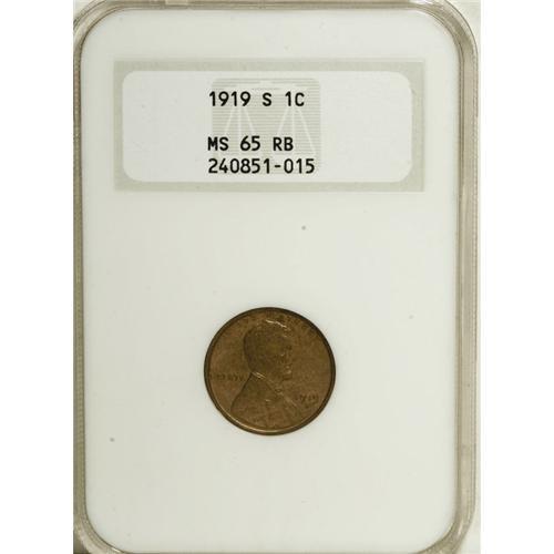 <B>1919-S 1C MS65 Red and Brown NGC.</B></I> Despite the high mintage of this issue (139,760,000 pieces) desirable Mint State coins are in short supply. David Lange (2005) reports that this is because: "Most are from heavily worn dies, while the planchet stock used (as with most S-mint cents from this decade) precluded the survival of many pieces with bright mint red." The Red and Brown Gem in this lot displays attractive copper-gold luster tinted with hints of light tan, and on the upper reverse, a splash of sky-blue. An above average strike occurs on both sides, and includes sharpness in the bow tie and on all of the grains and lines of the wheat stalks. Housed in a former generation NGC holder. Census: 21 in 65 Red and Brown, 0 finer (4/07).<BR><BR><b>Shipping:</b> Coins & Currency (<a target="_blank" href="http://www.heritageauctions.com/common/shipping.php">view shipping information</a>)