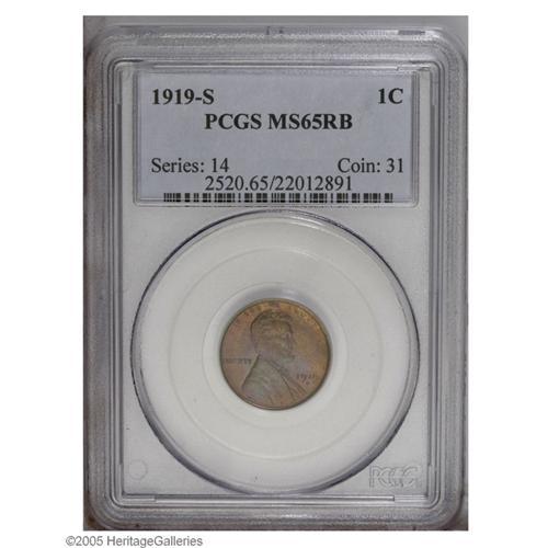 <B>1919-S<1C> MS65 Red and Brown PCGS.</B></I> Richly toned with deep purple-rose and golden coloration on both sides. The matte-like surfaces only show a few tiny contact marks, including one on Lincoln's temple. A well struck Gem with pleasing luster and impressive preservation. Population: 19 in 65 Red and Brown, 0 finer in Red and Brown (10/05).