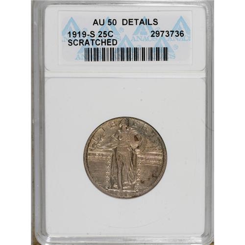 <B>1919-S 25C --Scratched--ANACS. AU50 Details. </B></I> NGC Census: (22/332). PCGS Population (17/236). Mintage: 1,836,000. Numismedia Wsl. Price for NGC/PCGS coin in AU50: $400. (#5732)<BR><BR><b>Shipping:</b> Coins & Currency (<a target="_blank" href="http://www.heritageauctions.com/common/shipping.php">view shipping information</a>)