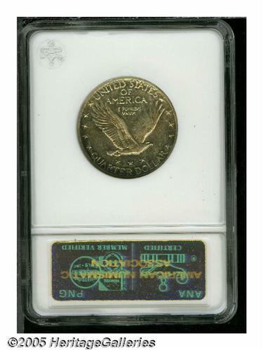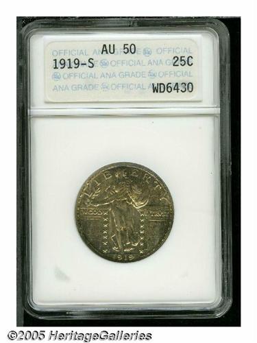 <B>1919-S<25C> AU50 ANACS.</B></I> This is a scarce date that is often found on collector want lists. The example that we are offering has light wear on the high points as expected for the grade. The semi-bright silvery surfaces display wisps of aqua, lavender, yellow, and cobalt-blue toning, and are essentially devoid of mentionable marks. The design elements reveal sharp definition.<BR><I>From The Stig Ericsson Collection.</B></I>