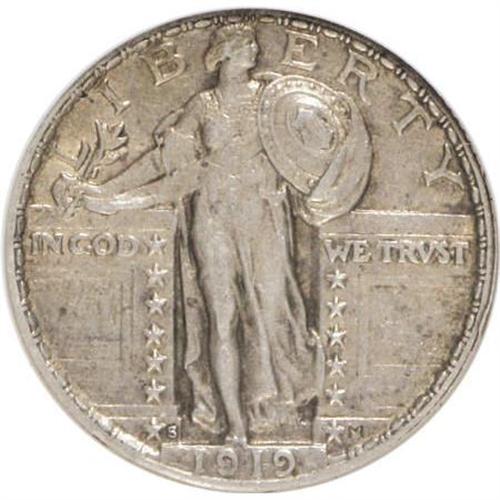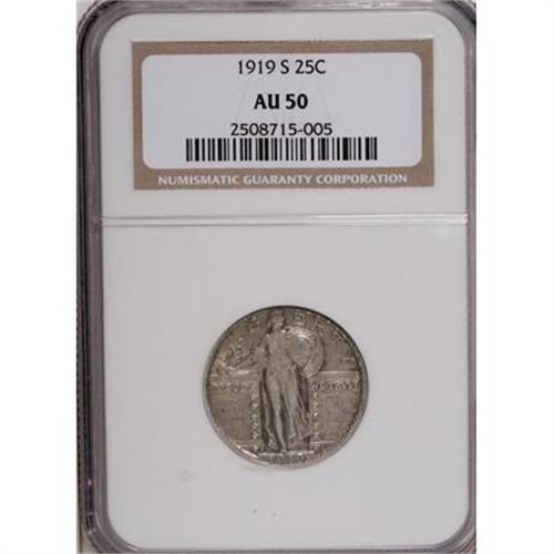 <B>1919-S 25C AU50 NGC.</B></I> NGC Census: (11/170). PCGS Population (21/245). Mintage: 1,836,000. Numismedia Wsl. Price for NGC/PCGS coin in AU50: $475. (#5732)<BR><BR><B>Coin Engraver:</B> Hermon A. MacNeil<BR><BR><b>Shipping:</b> Coins & Currency (<a target="_blank" href="http://www.heritageauctions.com/common/shipping.php">view shipping information</a>)