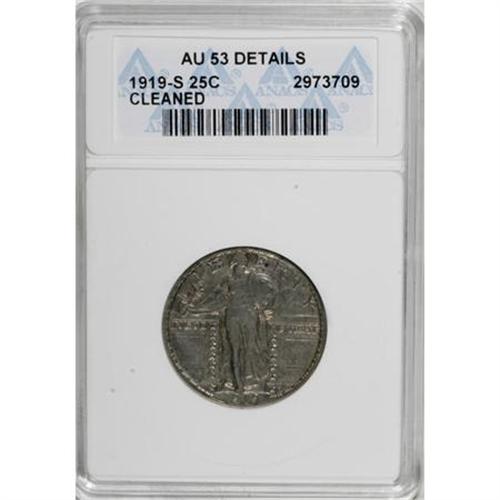 <B>1919-S 25C --Cleaned--ANACS. AU53 Details.</B></I> NGC Census: (10/157). PCGS Population (14/229). Mintage: 1,836,000. Numismedia Wsl. Price for NGC/PCGS coin in AU53: $425. (#5732)<BR><BR><B>Coin Engraver:</B> Hermon A. MacNeil<BR><BR><b>Shipping:</b> Coins & Currency (<a target="_blank" href="http://www.heritageauctions.com/common/shipping.php">view shipping information</a>)