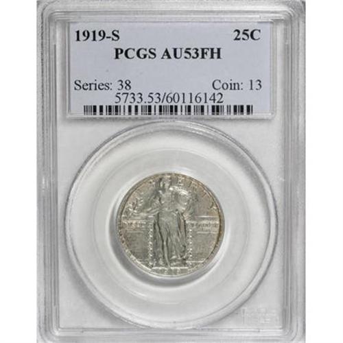 <B>1919-S 25C AU53 Full Head PCGS.</B></I> This is a great coin for the issue, as the striking details are very sharp on Liberty's head, the shield rivets, and the eagle's breast feathers. The mostly untoned surfaces show traces of lavender patina on the upper reverse and near the borders. A few faint hairlines can be detected in the fields. Still a conditionally desirable example of this Standing Liberty key date. <BR><BR><B>Coin Engraver:</B> Hermon A. MacNeil<BR><BR><b>Shipping:</b> Coins & Currency (<a target="_blank" href="http://www.heritageauctions.com/common/shipping.php">view shipping information</a>)