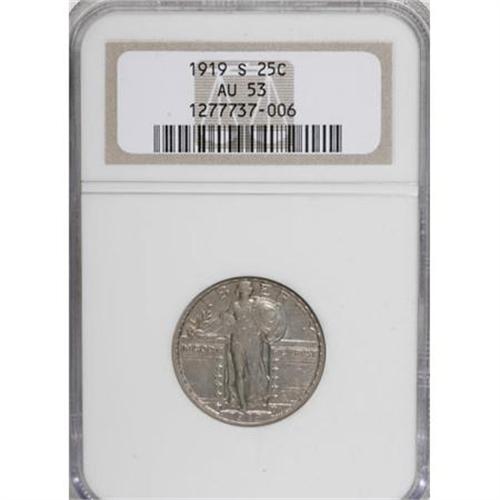 <B>1919-S 25C AU53 NGC.</B></I> NGC Census: (10/158). PCGS Population (14/231). Mintage: 1,836,000. Numismedia Wsl. Price for NGC/PCGS coin in AU53: $590. (#5732)<BR><BR><B>Coin Engraver:</B> Hermon A. MacNeil<BR><BR><b>Shipping:</b> Coins & Currency (<a target="_blank" href="http://www.heritageauctions.com/common/shipping.php">view shipping information</a>)