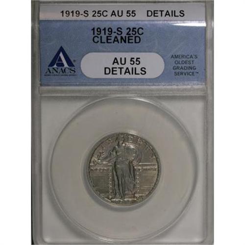<B>1919-S 25C --Cleaned--ANACS. AU55 Details.</B></I> NGC Census: (26/133). PCGS Population (43/188). Mintage: 1,836,000. Numismedia Wsl. Price for NGC/PCGS coin in AU55: $635. (#5732)<BR><BR><B>Coin Engraver:</B> Hermon A. MacNeil<BR><BR><b>Shipping:</b> Coins & Currency (<a target="_blank" href="http://www.heritageauctions.com/common/shipping.php">view shipping information</a>)