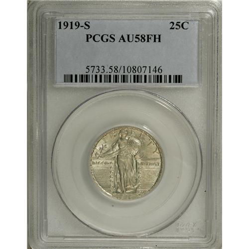 <B>1919-S 25C AU58 Full Head PCGS.</B></I> Very well struck for an early S-mint that is challenging on two fronts, both as a condition rarity and as a strike rarity. The untoned surfaces are bright and almost completely lustrous, being kept from Mint State status by a modest break in luster down Liberty's left (facing) leg.<BR><BR><b>Shipping:</b> Coin/Currency (<a target="_blank" href="http://www.heritageauctions.com/common/shipping.php">view shipping information</a>)