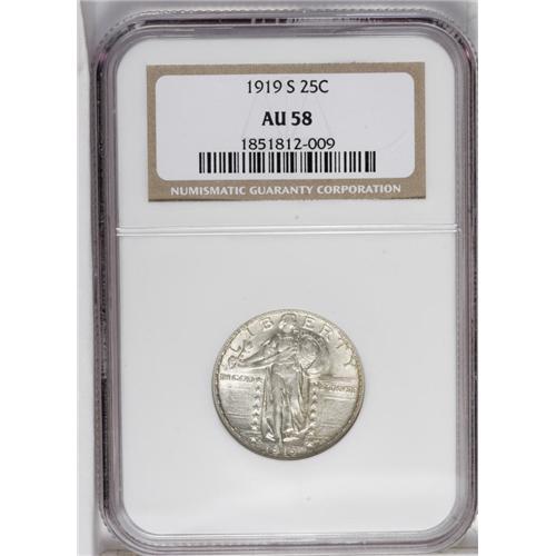 <B>1919-S<25C> AU58 NGC.</B></I> Well-defined over most of the devices, though the usual trouble spots display slight weakness. Lightly toned with nearly full luster and minimal marks.