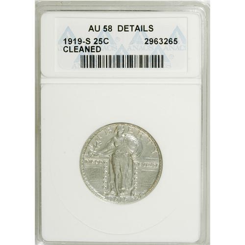 <B>1919-S 25C --Cleaned--ANACS. AU58 Details.</B></I> NGC Census: (23/109). PCGS Population (42/135). Mintage: 1,836,000. Numismedia Wsl. Price: $575. (#5732)<BR><BR><b>Shipping:</b> Coins & Currency (<a target="_blank" href="http://www.heritageauctions.com/common/shipping.php">view shipping information</a>)