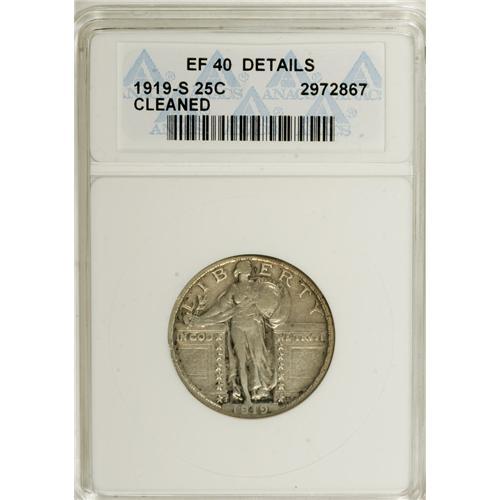 <B>1919-S 25C --Cleaned--ANACS. XF40 Details.</B></I> NGC Census: (36/408). PCGS Population (27/282). Mintage: 1,836,000. Numismedia Wsl. Price for NGC/PCGS coin in XF40: $360. (#5732)<BR><BR><b>Shipping:</b> Coins & Currency (<a target="_blank" href="http://www.heritageauctions.com/common/shipping.php">view shipping information</a>)