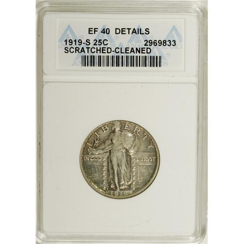 <B>1919-S 25C --Cleaned, Scratched--ANACS. XF40 Details.</B></I> NGC Census: (18/204). PCGS Population (27/282). Mintage: 1,836,000. Numismedia Wsl. Price for NGC/PCGS coin in XF40: $360. (#5732)<BR><BR><b>Shipping:</b> Coins & Currency (<a target="_blank" href="http://www.heritageauctions.com/common/shipping.php">view shipping information</a>)