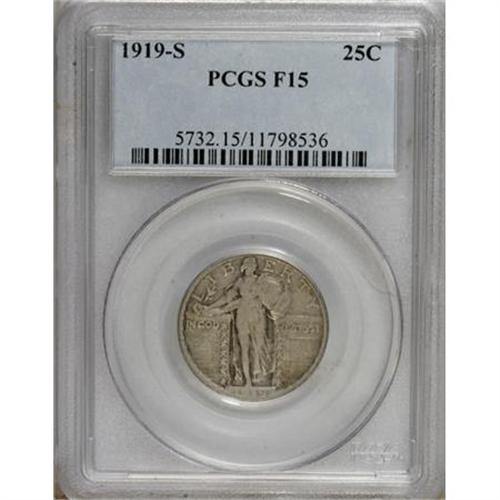 <B>1919-S 25C F15 PCGS.</B></I> PCGS Population (8/379). NGC Census: (6/254). Mintage: 1,836,000. Numismedia Wsl. Price for NGC/PCGS coin in F15: $158. (#5732)<BR><BR><B>Coin Engraver:</B> Hermon A. MacNeil<BR><BR><b>Shipping:</b> Coins & Currency (<a target="_blank" href="http://www.heritageauctions.com/common/shipping.php">view shipping information</a>)