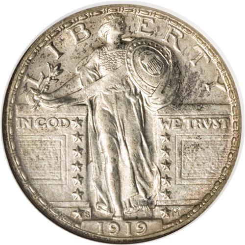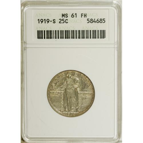 <B>1919-S 25C MS61 Full Head ANACS.</B></I> 1919-S quarters with Full Heads are a rare item. Indeed, J.H. Cline (2007) estimates that "2% (are) struck with Full Heads." Equally significant, bold definition is seen throughout on this piece, including the chain mail, rivets, vertical stripes on the shield, most of the eagle's plumage, and the stars on each side. The surfaces exhibit soft luster, and are visited by wisps of olive-gray and reddish-tan color. Close inspection with a loupe reveals die polish lines on both sides, along with some stray hairlines.<BR><BR><b>Shipping:</b> Coins & Currency (<a target="_blank" href="http://www.heritageauctions.com/common/shipping.php">view shipping information</a>)