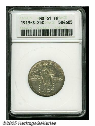 <B>1919-S<25C> MS61 Full Head ANACS.</B></I> Semi-bright silvery surfaces display wisps of gray and olive patina. Wispy slide marks are observed on Liberty's midsection, and myriad lines occur on the obverse, some of which are die polish lines, and others are post strike. Excellent design definition is apparent, culminating in Full Head designation.<BR><I>From The Stig Ericsson Collection.</B></I>