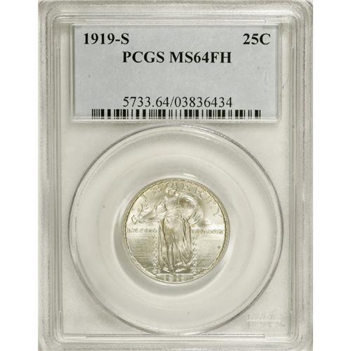 <B>1919-S 25C MS64 Full Head PCGS.</B></I> This is an extraordinary opportunity for the advanced Set Registry collector. Full Head examples of the '19-S are extremely rare as noted by J.H. Cline: "The 1919-S has long been considered one of the key coins of the series among most collectors and dealers." A remarkable coin, this example is fully struck in nearly all areas, with the exception of two shield rivets at 7 o'clock, an area that is weakly defined on nearly every existing Standing Liberty quarter, regardless of date. The upper reverse also exhibits weakness through part of the legend. The surfaces are frosty and fully brilliant. Population: 12 in 64, 14 finer (3/07).<BR><BR><b>Shipping:</b> Coins & Currency (<a target="_blank" href="http://www.heritageauctions.com/common/shipping.php">view shipping information</a>)