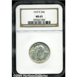 <B>1919-S<25C> MS65 NGC.</B></I>This is a splendid Gem with light champagne and olive toning over satiny silver surfaces. Very sharply struck with completely defined shield details on the obverse, although the head is only partially detailed. This is one of the key-date issues in the series.<BR><I>From The Barry Donnell Collection, Part Two.</B></I> <BR><BR><B>Important notice:</B> Heritage usually auctions material at the rate of 200-250 lots per hour. On some occasions eBay Live bid software or the Internet may not be able to keep up with the pace of the auction. We recommend placing a realistic absentee bid now as insurance to avoid disappointment. Occasionally the auctioneer may eliminate or reject an eBay Live bid, and the auctioneer may also reopen a lot after the close of the eBay live bidding (usually because we missed an audience bid), and may reject your bid even if it shows you as the winning bidder. By bidding via eBay Live, you agree that Heritage may award the lot to another bidder at its sole discretion under the circumstances described above or any other reasonable circumstances. Since eBay bids are not shown to us until we open the lot on the floor, we treat those bids just like floor bids. In most cases the floor responds before the eBay bid is presented to us, due to Internet lag time, so for consistency we have made it a policy that floor bids are always considered first over tie eBay live bids. Also please note that all Heritage lots purchased through eBay Live carry a 20% Buyer's Premium. Please make sure you read the Terms and Conditions before you bid. </span></font></tr></table></td></tr></table>