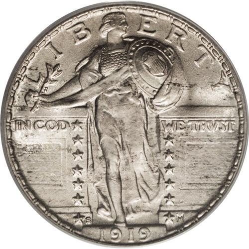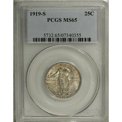<B>1919-S 25C MS65 PCGS.</B></I> Vibrant luster adorns each side of this highly respected San Francisco Mint issue. Freckles of dark tan color are really only noticeable under magnification, and the design features illustrate great definition, including clarity in all of the rivets, though two near the hip are soft, and on the vertical stripes of the shield. Some small contact marks on Liberty's head are mentioned for accuracy. Population: 39 in 65, 10 finer (12/06).<BR><BR><b>Shipping:</b> Coin/Currency (<a target="_blank" href="http://www.heritageauctions.com/common/shipping.php">view shipping information</a>)