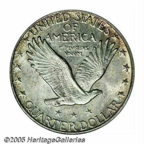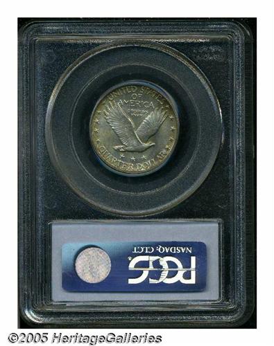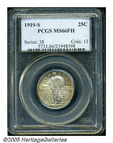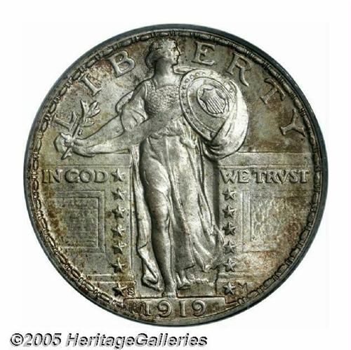 <B>1919-S<25C> MS66 Full Head PCGS.</B></I> The 1919-S is a long-time key to the series and is very rare and undervalued in high grade and with full head definition. As J.H. Cline stated in his third edition of <I>Standing Liberty Quarters:</B></I> "Normally the "S" mint in any given year is weak when compared to the "D." However, this is not the case in 1919. Normal weakness persists, both obverse and reverse. Again, rivets are missing from shield. Lines in shield are shallow. Gown lacks sharp details." This is a remarkably sharp strike for the issue, and as such it probably deserves the bump from MS65 to MS66 for that reason alone. However, the surfaces are also bright and lustrous with the usual S-mint sheen, and each side shows ever-deepening golden-brown toning toward the rims. The only mark we see (and a useful pedigree identifier as well) is a short horizontal mark along Liberty's jawline, but a magnifier will be required to actually single out this abrasion. Very rare, as stated, in high grades, with only two other pieces certified as MS66 by PCGS and one finer, while NGC has graded two as such with two others finer (4/05).<BR><I>From The Western Hills Collection.</B></I>