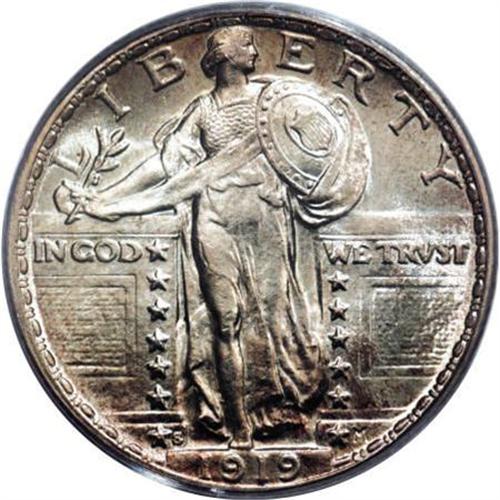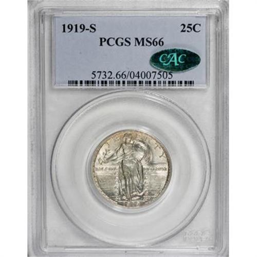<B>1919-S 25C MS66 PCGS. CAC.</B></I> A thin veneer of champagne-gold patina graces each side of this radiantly lustrous Premium Gem. While not quite fully struck, the design elements exhibit strong definition, and the surfaces are impeccably preserved, all of which enhance the coin's all-around eye appeal. This is the finest that most collectors can hope to acquire, as indicated by the population figures below. Population: 10 in 66, 0 finer (11/07).<BR><I>From The Hoffy Collection, NGC's #3 Registry Collection of Standing Liberty Quarters.</B></I><BR><BR><B>Coin Engraver:</B> Hermon A. MacNeil<BR><BR><b>Shipping:</b> Coins & Currency (<a target="_blank" href="http://www.heritageauctions.com/common/shipping.php">view shipping information</a>)