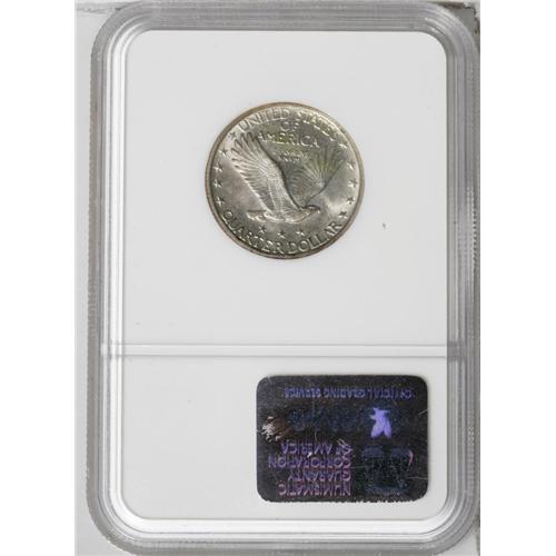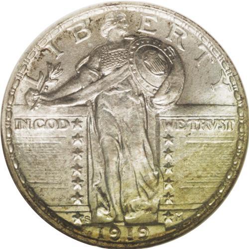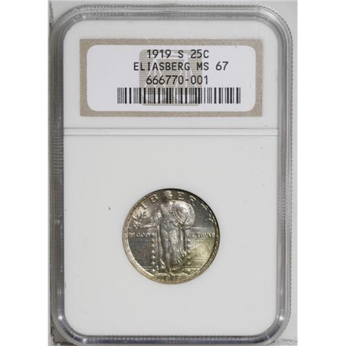 <B>1919-S<25C> MS67 NGC.</B></I> Eliasberg. The 1919-S is one of the most highly respected issues in the Standing Liberty quarter series. The mintage is low with only 1.83 million pieces produced, therefore making it an absolute rarity. But the 1919-S is also a condition and strike rarity. Only two other pieces have been certified in MS67 Full Head (both at NGC). This piece shows almost complete detailing on the head of Liberty. The Eliasberg catalog accurately called it 90% Full Head. As such, it represents excellent value for the collector who wants strong definition without paying the premium for a Full Head coin. The surfaces are bright and lustrous with pale pastel toning on each side. An outstanding 1919-S quarter.<BR><I>Ex: Eliasberg (Bowers and Merena, 4/97), lot 1633.</B></I><BR><I>From The Brevard Gold & Silver Former #2 NGC Registry of Standing Liberty Quarters.</B></I>