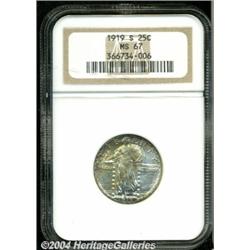 <B>1919-S<25C> MS67 NGC.</B></I> Outstanding overall quality and striking details are seen on this lovely coin. Approximately two-thirds of the head detail is present on Liberty and the surfaces overall are immaculate. The mint luster is thick and frosted with a light accent of golden-olive toning seen on each side (more is on the obverse than the reverse). Like the Gem above, this coin represents excellent value for the advanced collector as so much of the head detail is present and the surfaces are so well preserved. Technically unimprovable and very close to that almost unattainable Full Head classification. Population: 2 in 67, 0 finer (7/04). <BR><BR><B>Important notice:</B> Heritage usually auctions material at the rate of 200-250 lots per hour. On some occasions eBay Live bid software or the Internet may not be able to keep up with the pace of the auction. We recommend placing a realistic absentee bid now as insurance to avoid disappointment. Occasionally the auctioneer may eliminate or reject an eBay Live bid, and the auctioneer may also reopen a lot after the close of the eBay live bidding (usually because we missed an audience bid), and may reject your bid even if it shows you as the winning bidder. By bidding via eBay Live, you agree that Heritage may award the lot to another bidder at its sole discretion under the circumstances described above or any other reasonable circumstances. Since eBay bids are not shown to us until we open the lot on the floor, we treat those bids just like floor bids. In most cases the floor responds before the eBay bid is presented to us, due to Internet lag time, so for consistency we have made it a policy that floor bids are always considered first over tie eBay live bids. Also please note that all Heritage lots purchased through eBay Live carry a 20% Buyer's Premium. Please make sure you read the Terms and Conditions before you bid. </span></font></tr></table></td></tr></table>