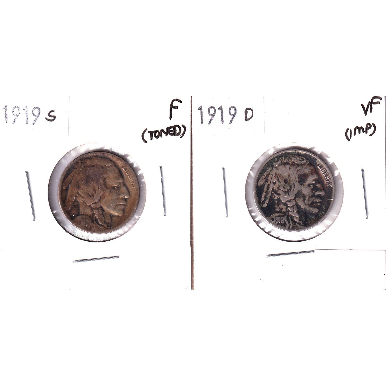 1919-S 5-cent Fine (toned) & 1919D 5-cent VF (impaired). 2pcs