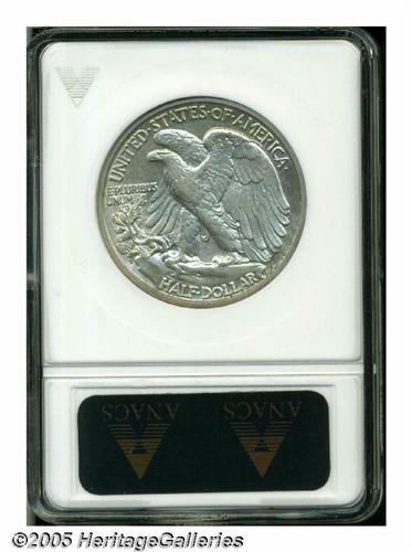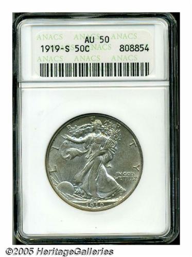<B>1919-S<50C> AU50 ANACS.</B></I> Light-grey color with some ruddy tonality and nice remaining luster. The present example shows light wear on the high points and some faint marks in the fields, but is overall quite attractive.