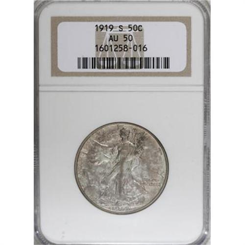 <B>1919-S 50C AU50 NGC.</B></I> A lightly worn and luminous representative of this S-mint key, fascinatingly toned with intriguing eye appeal. Bronze, gold, cloud-gray, and silver-blue toning drapes each side.<BR><BR><B>Coin Engraver:</B> Adolph A. Weinman<BR><BR><b>Shipping:</b> Coins & Currency (<a target="_blank" href="http://www.heritageauctions.com/common/shipping.php">view shipping information</a>)