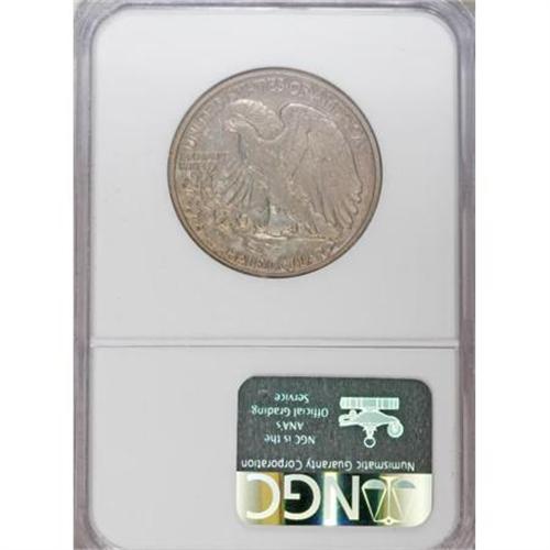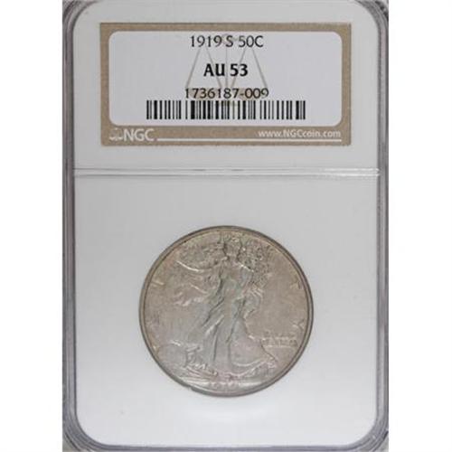 <B>1919-S 50C AU53 NGC.</B></I> Soft denim-blue patina drapes most of the still-lustrous surfaces, and the gold-orange patina that graces much of the rest shows occasional rose accents. Well struck, minimally marked, and highly appealing.<BR><BR><B>Coin Engraver:</B> Adolph A. Weinman<BR><BR><b>Shipping:</b> Coins & Currency (<a target="_blank" href="http://www.heritageauctions.com/common/shipping.php">view shipping information</a>)