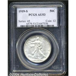 <B>1919-S<50C> AU53 PCGS.</B></I> Evenly colored in gray patina, this early S-mint half is seemingly conservatively graded as wear is undistracting and abrasions are at an absolute minimum for the grade. <BR><BR><B>Important notice:</B> Heritage usually auctions material at the rate of 200-250 lots per hour. On some occasions eBay Live bid software or the Internet may not be able to keep up with the pace of the auction. We recommend placing a realistic absentee bid now as insurance to avoid disappointment. Occasionally the auctioneer may eliminate or reject an eBay Live bid, and the auctioneer may also reopen a lot after the close of the eBay live bidding (usually because we missed an audience bid), and may reject your bid even if it shows you as the winning bidder. By bidding via eBay Live, you agree that Heritage may award the lot to another bidder at its sole discretion under the circumstances described above or any other reasonable circumstances. Since eBay bids are not shown to us until we open the lot on the floor, we treat those bids just like floor bids. In most cases the floor responds before the eBay bid is presented to us, due to Internet lag time, so for consistency we have made it a policy that floor bids are always considered first over tie eBay live bids. Also please note that all Heritage lots purchased through eBay Live carry a 20% Buyer's Premium. Please make sure you read the Terms and Conditions before you bid. </span></font></tr></table></td></tr></table>