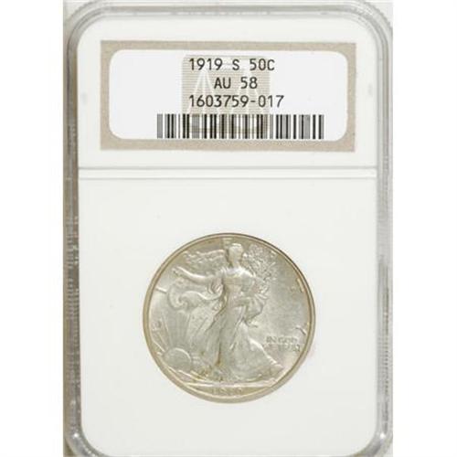 <B>1919-S 50C AU58 NGC.</B></I> Though the central devices show the usual softness for this San Francisco issue, the coin shows only a trace of actual friction. Delicate sky-blue, gold, and olive-tan tints drape the luminous surfaces.<BR><BR><B>Coin Engraver:</B> Adolph A. Weinman<BR><BR><b>Shipping:</b> Coins & Currency (<a target="_blank" href="http://www.heritageauctions.com/common/shipping.php">view shipping information</a>)