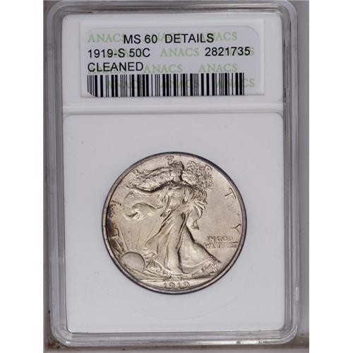 1919-S 50C --Cleaned--ANACS. MS60 Details. Lightly tone 1919-S[50C]--Cleaned--ANACS. MS60 Details.