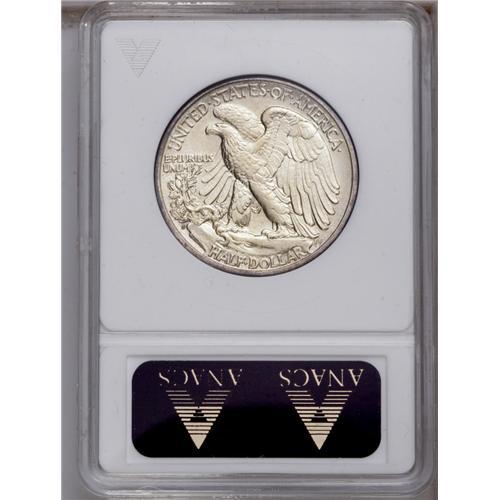 <B>1919-S<50C>--Cleaned--ANACS. MS60 Details.</B></I> Lightly toned in gold hues with a glimpse of deeper cobalt-blue and russet along the left obverse margin. This better date half is glossy and a bit subdued, but has bold details and only a single small mark at 7:30 on the reverse.