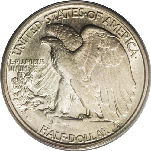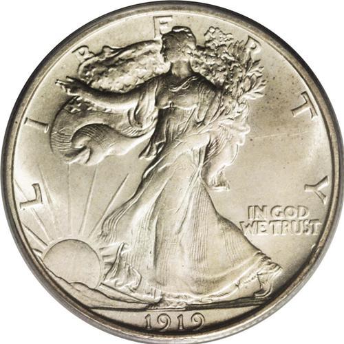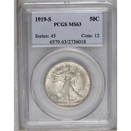 <B>1919-S<50C> MS63 PCGS.</B></I> This elusive Walking Liberty issue boasts pleasing luster with golden-gray surfaces and glimpses of lilac and blue. The usually seen softness is present on the eagle's breast and Liberty's branch hand. The Select grade of the present piece potentially represents a good compromise between quality and price.