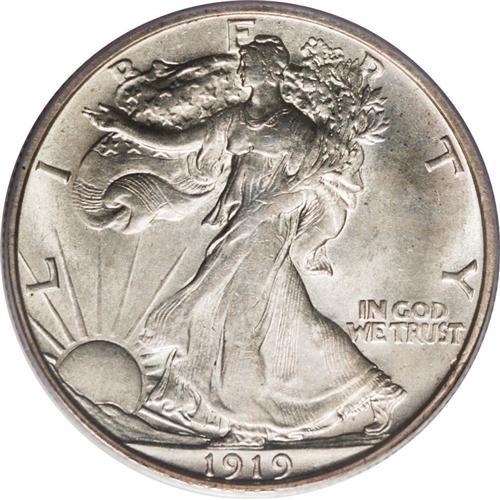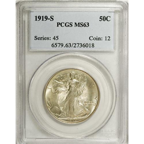 <B>1919-S 50C MS63 PCGS.</B></I> This elusive Walking Liberty issue boasts pleasing luster with golden-gray surfaces and glimpses of lilac and blue. The usually seen softness is present on the eagle's breast and Liberty's branch hand. The Select grade of the present piece potentially represents a good compromise between quality and price.<BR><BR><b>Shipping:</b> Coin/Currency (<a target="_blank" href="http://www.heritageauctions.com/common/shipping.php">view shipping information</a>)