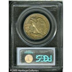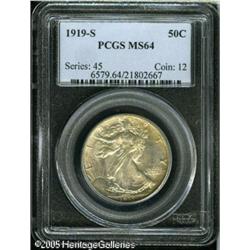 <B>1919-S 50C MS64 PCGS.</B></I> Although this S-mint issue boasts the highest original mintage of the three 1919 Walking Liberty Half Dollar issues, it is the scarcest of the three in Mint State preservation. Mottled golden and russet accents are seen over the right side of the obverse and all of the reverse. Both sides are better struck than most, and the reverse is free of contact marks, while the obverse shows just a couple of tiny ones on the right side. Slightly subdued luster qualities seem to rule out a higher grade.<BR><I>From The William & Harrison Hiatt Registry Collection, Part Two.</B></I> Lot:7972