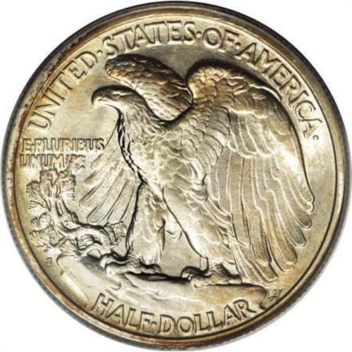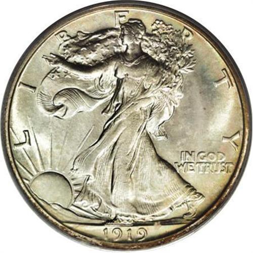 <B>1919-S 50C MS65 PCGS. CAC.</B></I> While the 1919-D is certainly more famous for its condition rarity, the 1919-S half dollar is certainly an elusive issue in the Gem grades. This frosty Mint State coin has mostly brilliant silver surfaces with bold luster. Each side is visited by light gold and iridescent toning, especially near the borders. Although less than a full strike (and all 1919-S half dollars are the same in this regard), the example offered here has bold details in most areas, including traces of an outlined thumb at the central obverse.<BR> The combination of a low-population rarity and a successful CAC quality review should heighten the overall demand for this specimen. Population: 38 in 65, 11 finer (1/08).<BR><BR><B>Coin Engraver:</B> Adolph A. Weinman<BR><BR><b>Shipping:</b> Coins & Currency (<a target="_blank" href="http://www.heritageauctions.com/common/shipping.php">view shipping information</a>)