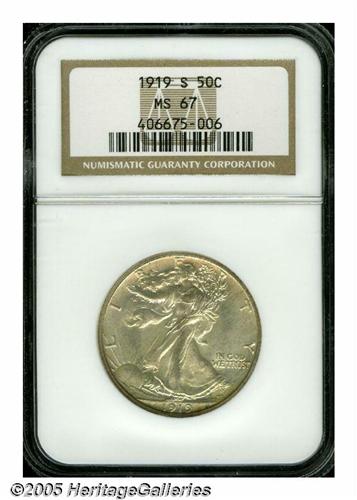 <B>1919-S<50C> MS67 NGC.</B></I> This issue is not nearly as rare as the '19-D Half Dollar in Gem condition, but Superb Gem examples are all but non-existent. In fact, this is the single finest 1919-S Half Dollar to be certified by either PCGS or NGC. Time was that this issue was actually considered rarer than the Denver Mint coin in Mint State grades. Witness the 1956 <I>Guide Book,</B></I> where the '19-D cataloged for $250 in Uncirculated, and the '19-S for $450. Those were the days. This satiny Gem has brilliant ivory surfaces with hints of natural champagne toning. Wisps of iridescence are visible along the borders. The fields are nearly prooflike in appearance. Although not fully struck, this example is nearly so. This example also has a sharply defined and well-formed mintmark, unlike so many where the small letter S is barely recognizable. The importance of this opportunity can not be overemphasized. Prior to this appearance, we have only handled one example finer than the MS65 grade. In July 2002, we sold an MS66 grade coin. Population: 1 in 67, 0 finer (6/05).<BR><I>From The Robert Moreno Collection.</B></I>
